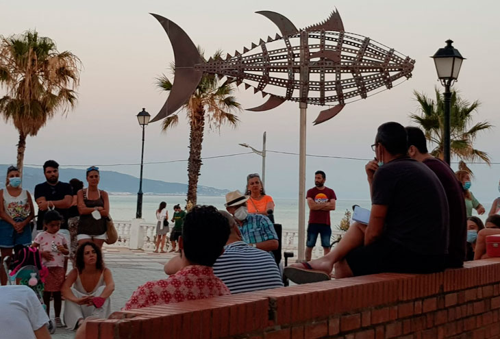 Unos 50 artistas de los casi 180 de los que se tiene constancia en el municipio de Barbate, se han concentrado en la plaza del Faro para intentar consensuar una salida a sus respectivas situaciones laborales, ya que las limitaciones de aforo y las exigencias sanitarias han provocado la inactividad de este sector que tiene complicado el actuar en terrazas de bares o restaurantes para amenizar las veladas nocturnas del verano.