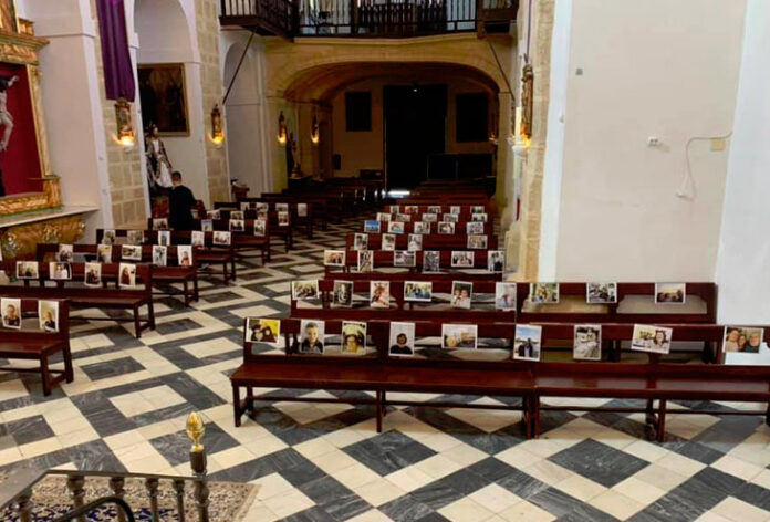 El párroco de la iglesia de Santa Catalina de Conil llena los bancos de fotografías de sus feligreses