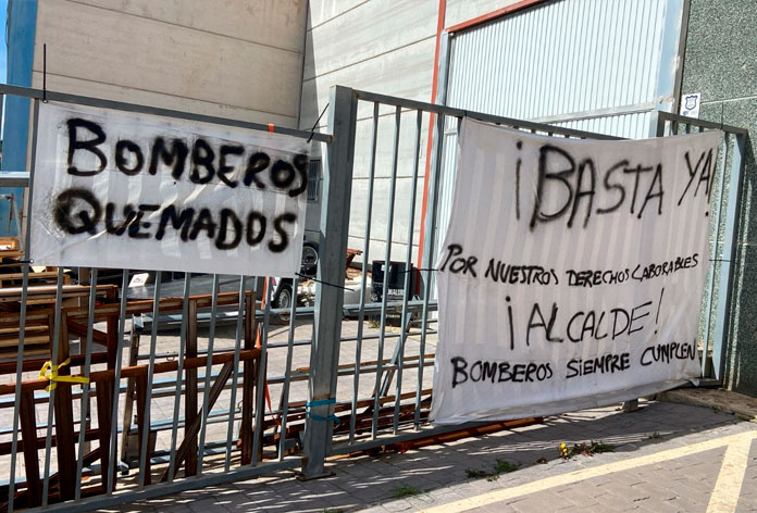 En la valla que rodea las instalaciones del parque de bomberos de Barbate hay colgadas un par de pancartas que gritan lo que los trabajadores llevan reclamando desde hace tiempo y sin embargo, no se les atiende.