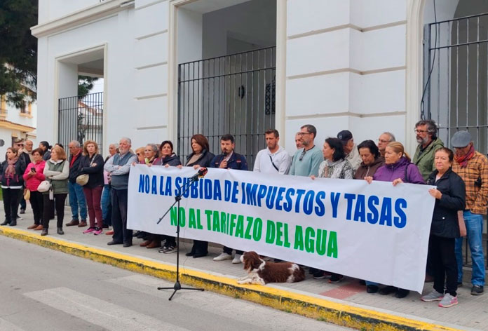 Medio centenar de personas se han manifestado frente al Ayuntamiento de Barbate para exigir la retirada de las ordenanzas municipales que actualizan las tasas del agua, aprobadas en el pleno por el equipo de Gobierno y tildadas como ‘Tarifazo’ por parte de la oposición.