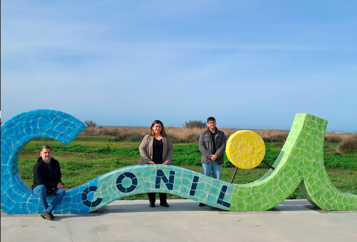 La alcaldesa de Conil, Inmaculada Sánchez, junto al delegado municipal de Turismo, José Ramón Rosado, y el delegado de Urbanismo, Pedro Pérez, ha presentado oficialmente una nueva escultura turística en el Paseo Marítimo. La obra, diseñada por Pedro Chico, representa el logotipo de la imagen de Turismo y está elaborada con llamativos azulejos de colores que simbolizan el mar, la playa, el sol y el campo.