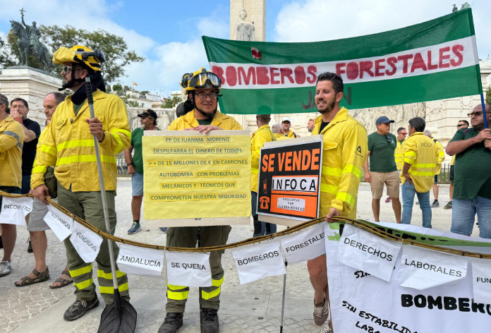 Bajo el lema “Infoca no se vende, se lucha y se defiende”, los efectivos del Plan Infoca se han concentrado este miércoles frente a la subdelegación de la Junta de Andalucía en Cádiz, en la Plaza de España.