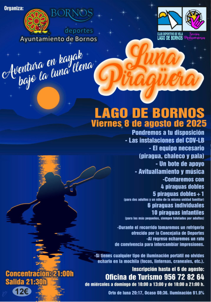 Según ha informado el alcalde de Borno, Hugo Palomares, la Delegación Municipal de Deportes del Ayuntamiento de Bornos y Coto de Bornos junto al Club deportivo de Vela Lago de Bornos, vuelve a organizar un paseo nocturno en kayak bajo la luz de la luna, denominado ‘luna piragüera’, este próximo viernes 8 de agosto para todo tipo de personas.