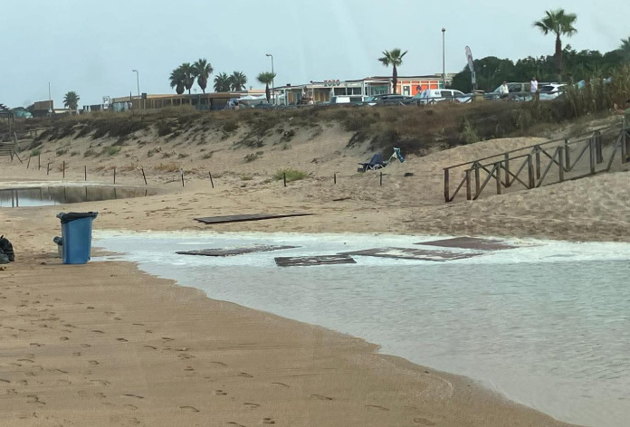 La playa de El Palmar de Vejer ha sufrido el temporal que esta semana ha azotado en gran medida a la costa gaditana. Las mareas han provocado fuerte arrastre e incluso se ha llevado por delante infraestructuras ligadas a la playa que han quedado destrozadas.