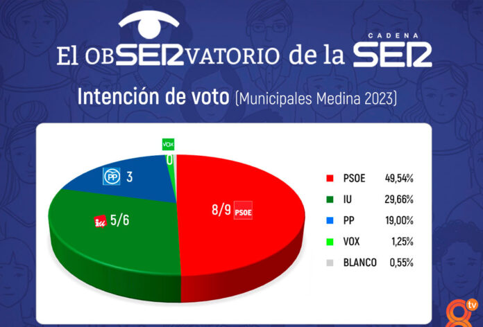El Observatorio de la Cadena SER y 8tv la Janda ha dado a conocer que el Psoe ganaría las elecciones municipales en Medina Sidonia con 49,54 por ciento de los votos por lo que obtendría entre 8 y 9 concejales. Izquierda Unida sería el segundo partido más votado con un 29,6 obteniendo entre 5 y 6 ediles. El Partido Popular por su parte, conseguiría un 19 por ciento de los votos que le asegurarían tres concejales en el salón de plenos del ayuntamiento de Medina Sidonia.